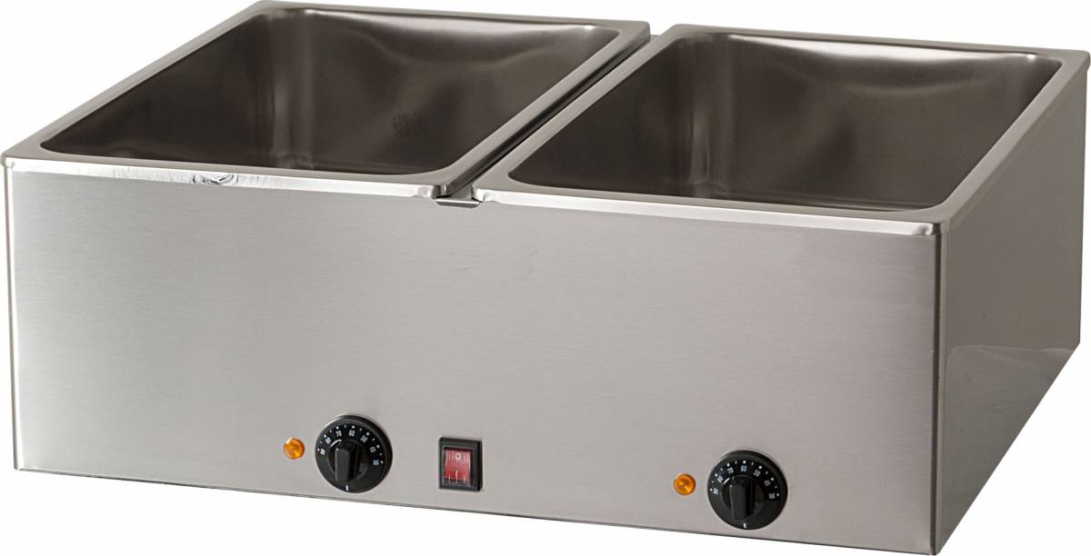 Bagnomaria gn1/1 bm221r. Struttura in acciaio inox - termostato di lavoro 0-90°C - temperature differenziate nei modelli doppi - il modello R è dotato di rubinetto di scarico - Tutti i modelli sono dotati di piastra riscaldante che garantisce un miglior rendimento e non si brucia in caso di mancanza di acqua.