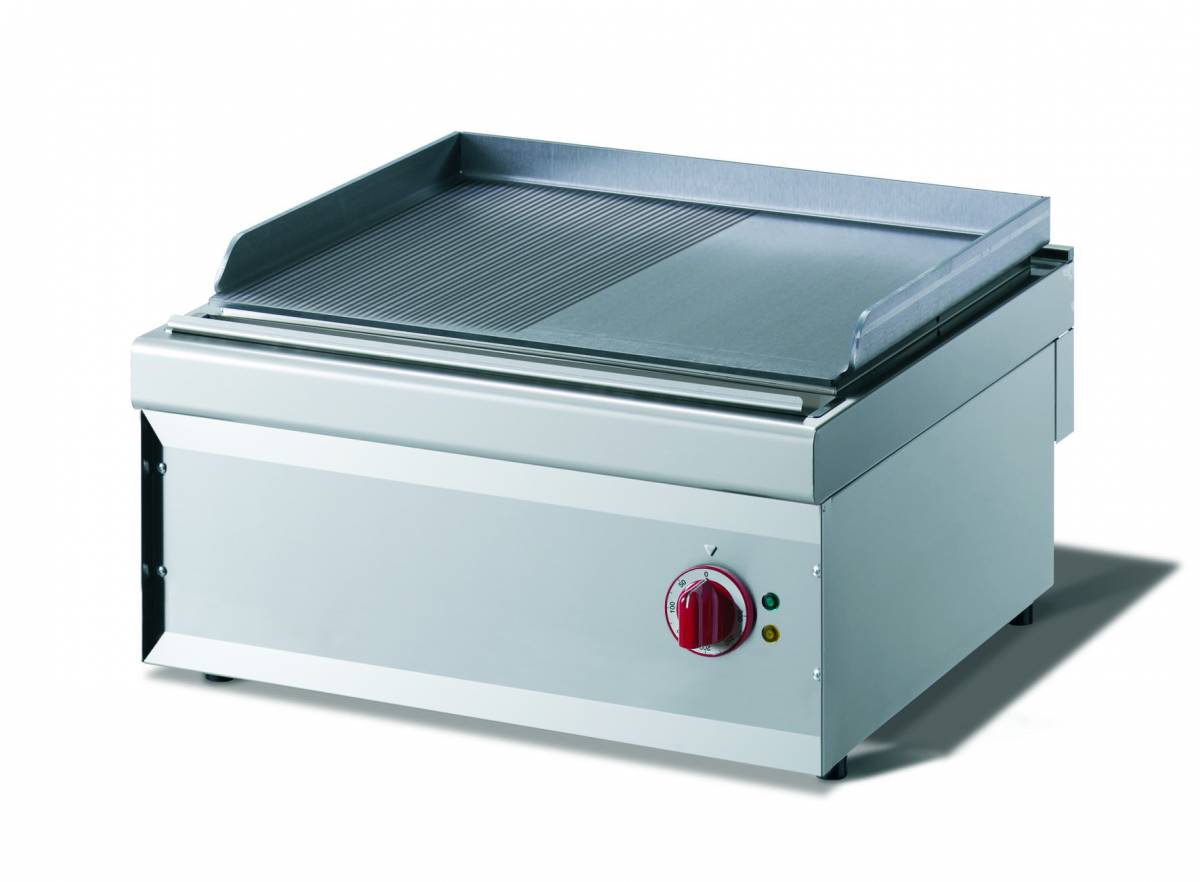 Frytop elettrico con piastra liscia-rigata. La piastra di cottura, di materiale ad alta conducibilità termica ha una superficie di 25,6 dm2 dotata, su 3 lati, di un robusto paraspruzzi. Un convogliatore di grassi e residui permette la loro facile raccolta in una vaschetta estraibile. Il riscaldamento, a mezzo di speciali resistenze corazzate, viene controllato da un interruttore generale, un termostato di lavoro, regolabile da 70°C-300°C, con contattore di potenza e spie luminose. La sicurezza è garantita da un termostato con contattore di sicurezza. Struttura costruita in acciaio inox