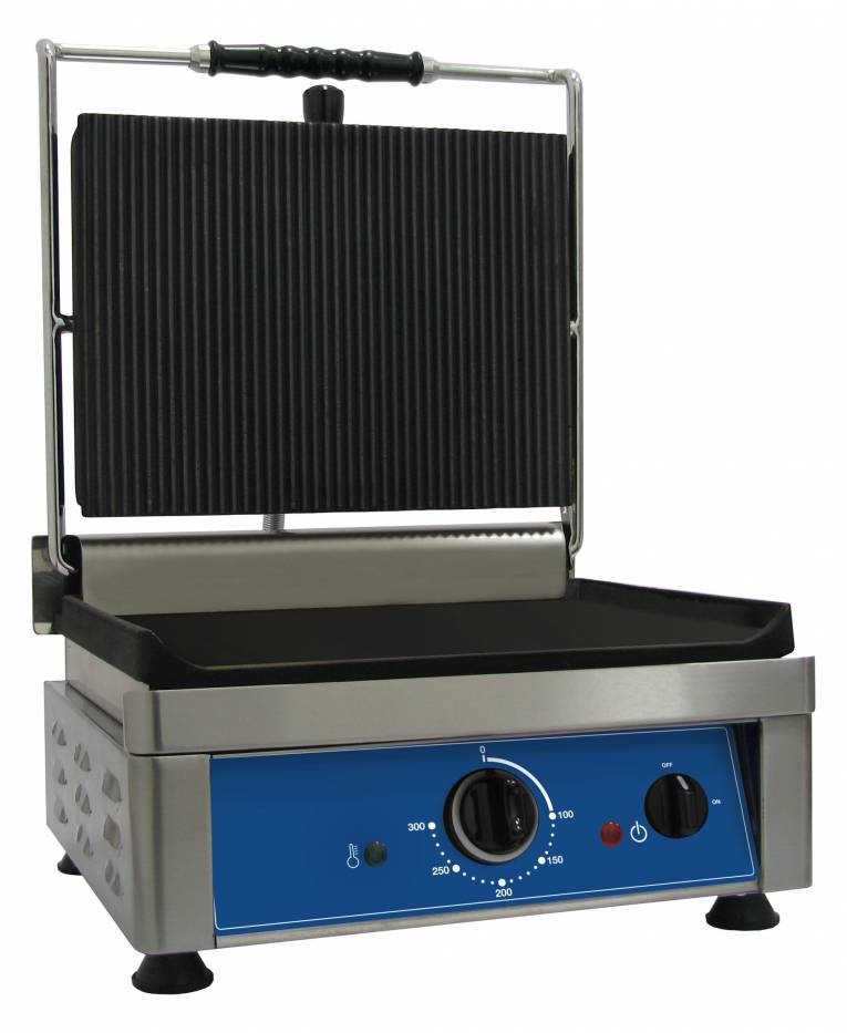 Piastra in ghisa pg36l. Struttura in acciaio inox - piano di cottura in ghisa - termostato di lavoro 0-300°C - il piano superiore è sempre rigato - il piano inferiore può essere liscio o rigato.